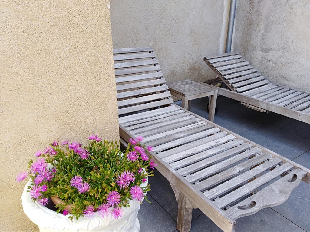 10 m op 18 m ( in domaine de Py “le vieux pigeonnier”) met vele ligstoelen en parasols.